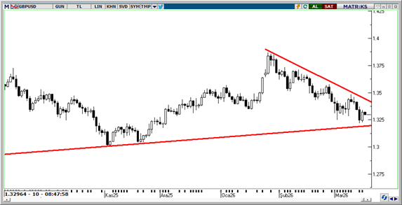1,32 yakınından destek bularak dört günlük düşüşün ardından dünü yükselişle tamamlayan GBPUSD’de, bu sabah saatlerinde işlemler 1,33 seviyesinin hemen üzerinde seyrediyor. Dolar endeksindeki primlenme kaynaklı olarak paritede kısa vadeli satıcılı seyir sürerken, yukarıda 200 günlük ortalamanın geçtiği 1,3370 seviyesi önemli bir direnç oluşturuyor. Bu direnç üzerinde ise 100 günlük ortalamanın denk geldiği 1,3440 seviyesi bulunuyor. Aşağıda ise sırasıyla 1,3290, 1,3246 ve 1,32 seviyeleri destek olarak izleniyor.