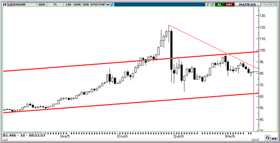 Gümüş fiyatları bu sabah saatlerinde 80$ seviyesinin hemen üzerinde işlem görüyor. Artan güvenli liman talebi ile birlikte kazançlarını koruyan dolar endeksi, değerli metallerdeki yükselişlerini sınırlayan bir unsur olarak öne çıkıyor. Gümüşte, yukarıda 20 günlük ortalamanın geçtiği 84,90$ ve 50 günlük ortalamanın denk geldiği 87$ seviyeleri önemli bir direnç alanı oluşturuyor. Aşağıda ise 80$ bölgesi güçlü destek alanıyken, bu bölge altında 77,25$ ve 74$ destekleri yer alıyor.