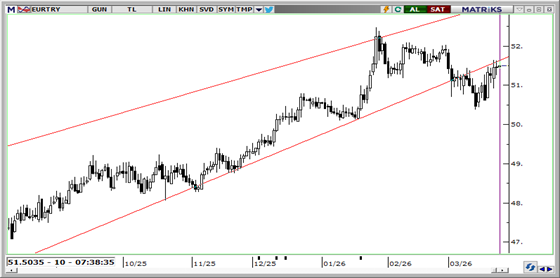Ateşkes planına ilişkin haber akışı ve Brent'in 100 dolar altına gerilemesi çapraz kurda baskıyı hafifletse de, müzakere cephesindeki muğlaklık ve sahada süren çatışmalar EURTRY'de temkinli seyri koruyor. Bu sabah 51,48 seviyesinde işlem gören kurda, yurt içi tarafta sıkı likidite ve yüksek faiz ortamı sert hareketleri sınırlamaya devam ediyor. Teknik olarak 51,50 ve 51,75 direnç; 51,35, 51,20 ve 51,00 destek olarak takip edilebilir.