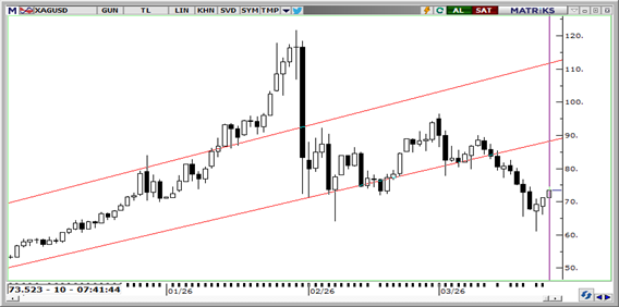 Sabah işlemlerinde 73,47$ düzeyinde bulunan gümüşte, petrolün 100 doların altına çekilmesi ve dolar endeksindeki hafif geri çekilme yukarı yönlü hareketi destekliyor. Ancak İran cephesinden gelen yalanlamalar ve çatışmaların sürmesi, risk iştahındaki toparlanmanın temkinli kalmasına neden oluyor. Bu çerçevede gümüşte kısa vadeli görünüm iyileşse de volatilitenin sürmesi beklenebilir. Teknik olarak 72,00$, 70,00$ ve 68,50$ destek; 74,50$, 76,00$ ve 78,00$ ise direnç olarak takip edilebilir.