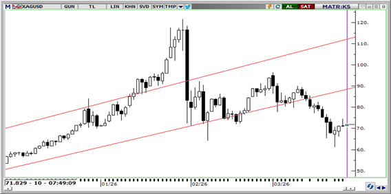 Gümüş bu sabah 71,76$ seviyesinde. Ateşkes görüşmelerine dair beklentiler kısmen destek sağlasa da, İran'ın planı reddetmesi ve doların 99,60 civarında güçlü kalması gümüşü baskı altında tutuyor. Endüstriyel talep tarafında ise enerji maliyetlerinin yüksek seyri sanayi görünümüne ilişkin kaygıları besliyor ve toparlanmayı zorlaştırıyor. Teknik olarak 70,00$ ve 68,50$ destek; 73,00, 74,50, ve 76,00$ direnç olarak takip edilebilir.