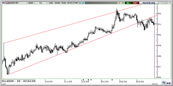 Savaşın Hürmüz açılmadan da bitebileceğine dair beklentiler EURTRY'yi bu sabah 51,06'ya geri çekti. Öte yandan euronun dolar karşısında zayıflamaya devam etmesi ve enerji fiyatlarının yüksek seyri, gerilemenin derinleşmesini engelliyor. Yurt içinde yüksek faiz ve sıkı likidite koşulları kurdaki sert hareketleri sınırlamaya devam ediyor. Teknik olarak 51,20, 51,35 ve 51,50 direnç; 51,00, 50,80 ve 50,60 destek olarak takip edilebilir.