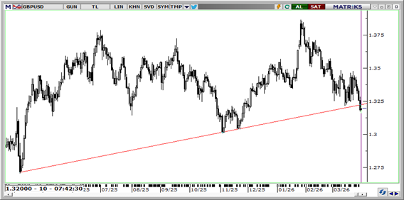 GBPUSD bu sabah 1,3200 seviyesinde. Trump'ın Hürmüz'ü ön koşul olmaktan çıkarması savaşın erken bitme ihtimalini güçlendirse de, boğazın kapalı kalmaya devam edebileceği İngiltere gibi enerji ithalatçısı ülkeler için risklerin sürdüğüne işaret ediyor. DXY'nin 100 üzerinde tutunması ve enerji fiyatlarının yüksek seyri sterlin üzerindeki baskıyı derinleştiriyor. Teknik olarak 1,3230, 1,3270 ve 1,3300 direnç; 1,3180, 1,3150 ve 1,3120 destek olarak izlenebilir.