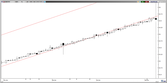Ateşkesin iki hafta süreyle daha uzatılması sonucunda jeopolitik risklerin bir süreliğine daha azaldığını söylemek mümkün. USDTRY bu sabah 44,54 seviyesinde, yükselen kanalın hemen altında işlem görmeye devam ediyor. Kur yeni zirve bölgesinde ve yukarı eğilim korunuyor. Teknik olarak 44,65, 44,75 ve 44,85 direnç; 44,55, 44,50 ve 44,40 destek olarak takip edilebilir.