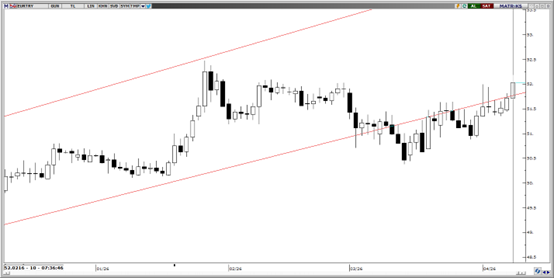 Kendini yükselen kanalın alt bandını hacimli şekilde kırarak içeri atan parite için yurt içinde faiz ve likidite koşulları volatil hareketlere engel olmaya devam ediyor. İndikatörler paritenin kanal içerisinde kapanışlarlar gerçekleştirmesi durumunda yukarı yönlü devam edeceğini gösteriyor. Teknik olarak 52,25, 52,50 direnç; 51,75, 51,40 ve 51,20 destek olarak izlenebilir.