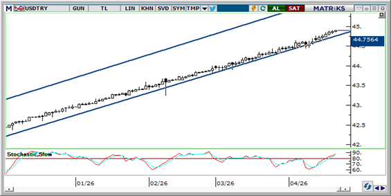 Yükseliş kanalı içerisindeki hareketini sürdürmekte olan USDTRY, bu sabah saatlerinde 44,89 seviyesinden işlem görüyor. Teknik göstergelerin ürettikleri sinyaller ve temel dinamikler çerçevesinde, kurdaki kademeli yükseliş eğiliminin korunmasını bekliyoruz. Kurda 44,90 bölgesi kısa vadeli direnç konumunda yer alırken, olası geri çekilmelerde 44,73, 44,69 ve 44,62 seviyeleri destek olarak takip edilecek.
