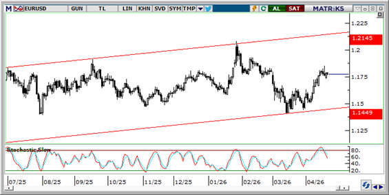 1,18 üzerinden gelen kar satışlarıyla birlikte son dönemdeki kazançlarının bir kısmını silen EURUSD paritesi, bu sabah saatlerinde 1,1777 seviyesinde işlem görüyor. Teknik göstergeler kısa vade için 1,17 – 1,1850 bandında bir hareket ihtimalini desteklerken, 1,1850’nin aşılması durumunda yukarı yönlü hareketin 1,20 seviyesine kadar devam etme ihtimalinin kuvvetli olduğunu gösteriyor. Paritede 1,1740, 100 günlük ortalamanın geçtiği 1,1707 ve 1,1670 seviyeleri destek, 1,1770, 1,1809 ve 1,1850 ise direnç olarak takip edilebilir.