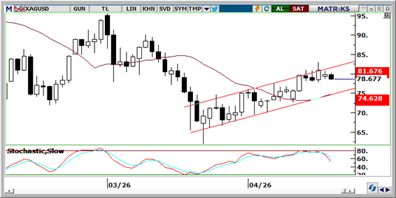 Kısa vadeli yükseliş kanalının üst sınırından gelen dirençle birlikte 80$ seviyesinin altına gerileyen gümüş fiyatları, bu sabah %1,2 kayıpla 78,85$ seviyesinde işlem görüyor. Teknik göstergeler, yükseliş eğiliminin korunabilmesi açısından, kanalın üst bandının bugün itibariyle geçtiği 81,70$ seviyesi üzerinde gerçekleşecek bir günlük kapanışın kritik olduğunu işaret ediyor. Gümüşte 50 ve 100 günlük ortalamaların oluşturduğu 78,50$ - 78,90$ bandı kısa vadede destek bölgesi olarak takip edilecek. Bu bölgenin altında 77,25$ ve 74$ destekleri yer alıyor. Yukarıda ise 80$, 81,70$ (kanal direnci) ve 82,40$ seviyeleri direnç konumunda bulunuyor.