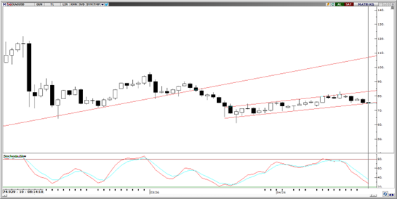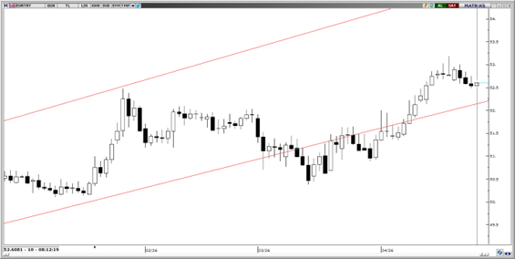 52,5 seviyesinden destek bulan EURTRY’de, aşağı yönlü fiyat hareketinin yavaşladığını görüyoruz. Teknik göstergeler 52,50 seviyesinin altında kapanışlar gelmediği taktirde bu bölgeden gerçekleşebilecek tepki alımları ile fiyatın tekrardan yükseliş eğilimine geçme ihtimalinin kuvvetli olduğuna işaret ediyor. Teknik göstergeler, kısa vadede 52,50 – 53,50 bandında bir hareketin ön planda olabileceğine işaret ediyor. Yukarıda 52,74, 52,9755 ve 53,13 seviyeleri direnç, aşağıda ise 52,50, 52,35 ve 52,20 seviyeleri destek olarak takip edilecek.