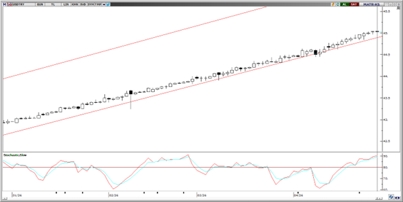Bu sabah saatlerinde 45,03 üzerinde işlem görmekte olan USDTRY’de, yukarı yönlü eğilim sürüyor. Teknik indikatörlerin ürettiği sinyaller ve temel makro dinamikler, yukarı yönlü kademeli yükseliş trendinin devamına işaret ediyor. Günlük grafikte izlenen teknik yapı, kanal alt bandına denk gelen 44,85 seviyesinin altında kalıcılık sağlanmasının mevcut konjonktürde düşük olasılık taşıdığına işaret ediyor. Kurda 43,03 – 45,05 bölgesi direnç, 44,9660, 44,8830 ve 44,8126 seviyeleri destek konumunda yer alıyor.