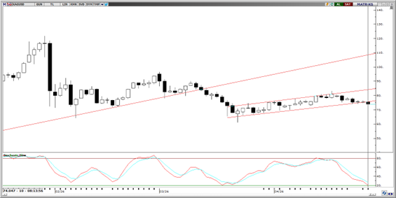 75,00$ seviyesine denk gelen yükselen kanalın alt bandını aşağı yönlü kıran gümüş, sabah saatlerinde 73,58$ civarında işlem görüyor. Teknik görünüm, 75$ seviyesinin altında kalıcılık sağlanması halinde aşağı yönlü eğilimin derinleşebileceğine işaret ediyor. Bu çerçevede, geri çekilmenin devamında 73,34$ ve 71,42$ seviyeleri destek olarak öne çıkıyor. Olası tepki alımlarında ise 74,82$, 76,00$ ve 78,15$ seviyeleri direnç konumunda izlenebilir.