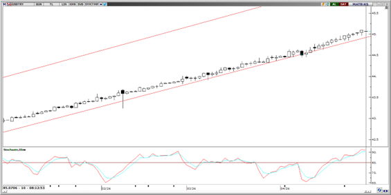Parite 45,09 seviyesini görerek tüm zamanların en yüksek seviyesini tazeledi. Teknik göstergelerden elde edilen sinyaller ile makroekonomik zemin birlikte analiz edildiğinde, fiyatlamaların yukarı yönlü kademeli trendini koruduğu görülüyor. Günlük periyotta oluşan teknik görünüm değerlendirildiğinde, kanal alt bandına karşılık gelen 44,85 seviyesinin altında kalıcı bir seyir oluşma olasılığı mevcut piyasa koşullarında zayıf kalıyor. Kurda 43,03 – 45,05 bölgesi direnç, 44,9660, 44,8830 ve 44,8126 seviyeleri destek konumunda yer alıyor.