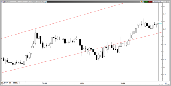 52,50 seviyesinden aldığı destekle yukarı yönlü ivmesini artıran parite, bu bölgeden gelen alım iştahının etkisiyle kısa vadeli pozitif görünümünü koruyor. Teknik indikatörler incelendiğinde, 52,50 seviyesinin altına yönelik geri çekilmelerin kalıcı olma ihtimalinin mevcut piyasa dinamikleri çerçevesinde sınırlı kaldığı görülüyor. Kısa vadeli perspektifte ise 52,50 – 53,50 bandında dalgalı bir seyir izlenirken, yukarı yönlü eğilimin ağırlık kazandığı bir fiyatlama davranışı öne çıkıyor. Yukarıda 52,97 ve 53,13 seviyeleri direnç olarak öne çıkarken, aşağıda 52,50, 52,35 ve 52,20 seviyeleri destek olarak takip edilebilir.