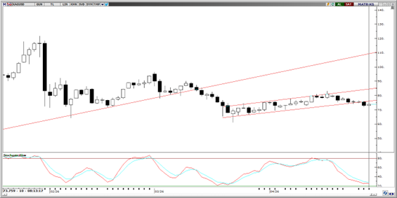 75$ seviyesine denk gelen kanal desteğini kırması sonrasında beklentilerimize paralel olarak düşüş eğilimini genişleten gümüş, dün 72$ seviyesine kadar geriledi. Bu sabah saatlerinde %0,7 primle 73,60$ seviyesinde işlem gören gümüşte, trend ve momentum indikatörleri kısa vade için 70$ - 76$ bandında bir hareket ihtimaline işaret ediyor. Gümüşte 20 günlük ortalamanın geçtiği 76$ seviyesi önemli direnç konumundayken, bu seviyesi öncesinde 74,82$ direnci bulunuyor. Geri çekilmenin devamında ise 73,34$ ve 71,42$ seviyeleri destek olarak izlenecek.