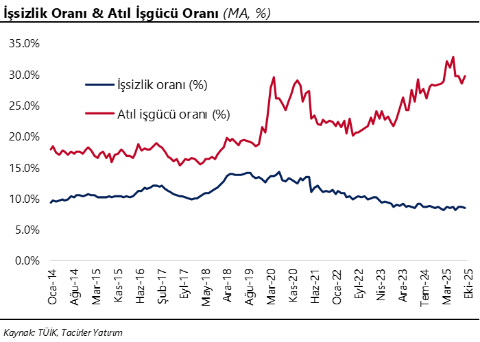 Mevsim etkisinden arındırılmış işsizlik oranı kasım ayında %8,6’dan %8,5’e geriledi. Bu dönemde işgücü 157.000 kişi artarak 35,8 milyona çıkarken, işgücü içerisinde istihdam edilenlerin sayısı ise 185.000 kişi artarak 32,8 milyon oldu. İşsiz kişi sayısı 27.000 kişi düşüşle 3 milyon olurken, İşgücüne katılım oranı ise %53,6’dan %53,8’e çıktı. İşgücü istatistikleri içerisinde yakından izlediğimiz ve daha geniş tanımlı bir işsizlik göstergesi olan âtıl işgücü oranı (zamana bağlı eksik istihdam, potansiyel işgücü ve işsizlerden oluşan geniş tanımlı işsizlik oranı) ise kasım ayında %28,5 seviyesinden %29,6’ya belirgin bir artış gösterdi. Atıl işgücü oranının detaylarına baktığımızda: Kasım ayı itibariyle zamana bağlı eksik istihdam ve işsizlerin bütünleşik oranı %17,9’dan %20’ye yükselirken, işsiz ve potansiyel işgücünün bütünleşik oranı ise %20,4’ten %19,5’e geriledi. Geniş tanımlı işsizlik göstergesi olan atıl işgücü oranının kasım ayında kaydettiği yükseliş ve bu oranın 2025 başından itibaren %30 civarında yapışkanlık sergiliyor olması, istihdam piyasasında manşet verinin ima ettiğinden daha zayıf bir görünüme işaret ediyor. İstihdam sektörüne yönelik öncü göstergelerin de zayıf sinyaller üretmeye devam ettiği görülüyor. İmalat PMI verisinde istihdama ilişkin alt kalemler, Kapasite Kullanım Oranı ve önümüzdeki 12 aylık sürece ilişkin işsiz kişi sayısına yönelik beklentiler, yakın dönem istihdam görünümü ile ilgili olumsuz bir zemine işaret ediyor.