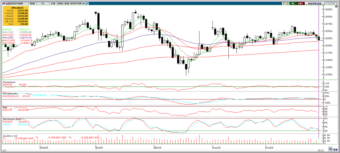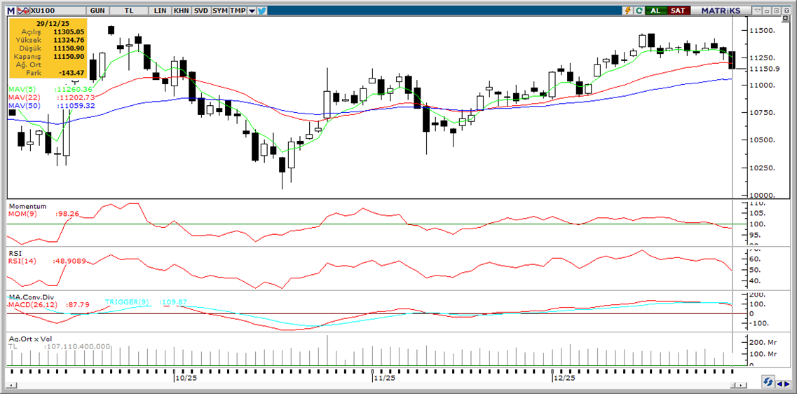 Küresel borsalar bu sabah zayıf bir görünüm sergiliyor, bu zayıflık haber akışının sınırlı kalması, yıl sonu piyasa katılımının azalması ve zirve seviyelerden kısmi kar satışları nedeniyle yaşanmakta. Borsa İstanbul’da ise, küresel borsaların üzerinde belirgin bir geri çekilme ile dünü 11.150 seviyesinde kapattık. Bankalar genel olarak güçlü kalırken, bankacılık dışı sektör hisselerinde genel olarak satışlar daha baskındı. BIST 100 Endeksi dün %1,3 gerilerken endekse en fazla pozitif katkı sağlayan ilk beş şirket YKBNK, TAVHL, GARAN, AKBNK, EFOR olurken, son bir haftada düzenli para girişi ile dikkat çeken şirketler ise KCHOL ve ASELS. Teknik açıdan 11.250 desteği altında 11.070 / 11.150 destek bandına dikkat çekiyorduk, dünkü kapanış bu bandın üst sınırında gerçekleşti. Ancak momentumdaki zayıflama ve yıl sonuna gelirken arbitraj pozisyonlarında çözülme nedeniyle baskının devamı görülebilir. Kısa vadede 11.250 artık direnç konumunda olacak. Günün ajandasında içeride işsizlik oranı, ekonomik güven endeksi, ABD’de konut fiyatları, Chicago ve Dallas aktivite endeksleri ve Fed tutanakları takip edilecek. Türkiye beş yıl vadeli CDS primleri 204 baz puanda ve düne göre 1 baz puan aşağıda. Son bir aya baktığımızda, Türkiye CDS primlerinin gelişen ülkeler içinde %14 gerileme ile en fazla gevşeyen, bu anlamda ülke riski fiyatlamasına göre en iyimser görünümü sergileyen CDS’ler olduğunu görüyoruz. Bu eğilimin devamı, kredi derecelendirme kuruluşlarından not ya da görünüm artırımı beklentilerini de destekleyecektir.