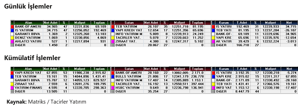 THYAO: Şirket, geri alım programı kapsamında pay başına 264,0–264,5 TL fiyat aralığından toplam 379 bin adet payını geri aldığını, toplam geri alınan pay tutarının 6,66 milyon adede ve sermayenin %0,48’ine ulaştığını açıkladı. Şirket, filosunda yer alan bir uçağın Arnavutluk’a hibe edildiğine yönelik haberlerin gerçeği yansıtmadığını, söz konusu uçağın mülkiyetinin hiçbir zaman şirkete ait olmadığını ve yalnızca operasyonel hizmet kapsamında kullanıldığını açıkladı.
