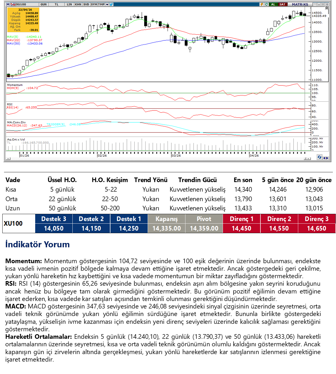 Günaydın. ABD - İran gerginliği ve uzlaşmazlık hali devam ediyor. Müzakerelerin bir türlü başlayamaması, ABD’nin devam eden deniz ambargosu ve İran menşeli ticari gemilere müdahaleler tansiyonu yüksek tutuyor. Petrol fiyatları yeniden 100 dolar civarına tırmanırken ABD ve Avrupa vadelileri ile Asya borsaları da genel olarak negatif bölgede. Borsa İstanbul’un kapalı kaldığı dün zayıf seyreden küresel risk iştahı bu sabah da aynı şekilde devam ediyor. Bu nedenle, Çarşamba günü %0,3 azalışla 14.335 puana gerileyen endekste bugün de 14.150’den geçen 10 günlük üssel hareketli ortalamaya bir geri çekilme görebiliriz. 14.000 ve 13.850 ise sonraki destekler olarak izlenebilir, dirençler ise 14.450 ve 14.600. Çarşamba günü endekse en fazla pozitif katkı sağlayan ilk beş şirket TUPRS, DSTKF, BIMAS, KTLEV, KUYAS; endekse negatif etki edenler ise AKBNK, EREGL, ASTOR, THYAO, SAHOL oldu. Son bir haftada düzenli para girişi ile dikkat çeken şirketler ise ULKER, GEREL, EUREN ve CWENE. Günün ajandasında içeride TCMB rezervleri ve haftalık yabancı işlemleri takip edilecek. Net ve Brüt rezervlerde 4 milyar dolara yakın artışlar hesaplıyoruz. ABD’de ise Michigan güven endeksleri izlenecek. Ek olarak, ABD – İran eksenli gelişmeler takip edilecektir. Türkiye 5 yıl vadeli CDS primleri güne 238 baz puandan başlıyor.