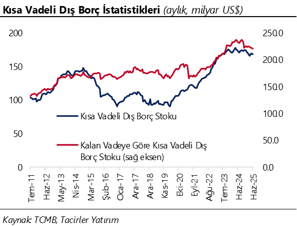 Kısa vadeli dış borç stoku haziran ayında aylık bazda %0,4 azalarak 168,2 milyar dolar olarak gerçekleşti. Kısa vadeli dış borç verilerinde özellikle “kalan vadeye göre kısa vadeli dış borç stoku” verisini, diğer bir deyişle orijinal vadesine bakılmaksızın vadesine 1 yıl ve daha kısa kalan dış borçları yakından takip ediyoruz. Söz konusu borç stoku Haziran 2025 itibariyle 220,3 milyar dolar seviyesinde oluşmuş durumda. Bu veriden, Türkiye’de yerleşik bankaların ve özel sektörün yurt dışı şubeleri ile iştiraklere olan borçlarını (25 milyar TL) çıkararak baktığımızda, borç stokunun 195,3 milyar dolar olduğu görülüyor. Bu veriye önümüzdeki 12 aylık cari açık beklentisini de ekliyoruz ve böylelikle Türkiye’nin önümüzdeki 1 yıllık süreçteki dış finansman ihtiyacını Haziran 2025 itibariyle yaklaşık olarak 220 milyar dolar civarında hesaplıyoruz.