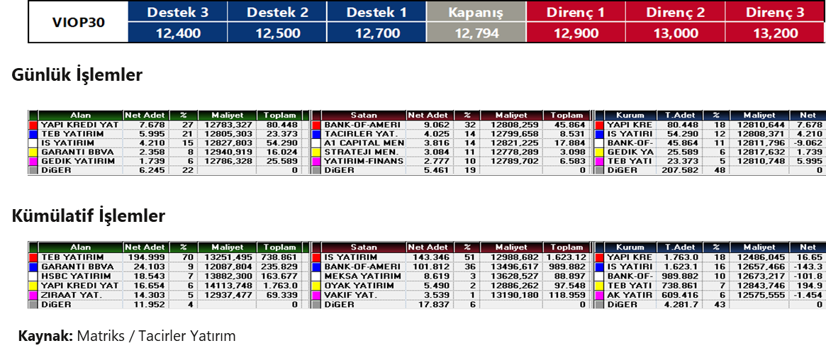 Ekim ayı VIOP 30 endeks kontratı, geçtiğimiz işlem gününde 12.794 puan seviyesinden günlük kapanış gerçekleştirdi. Bugün yukarı yönlü hareketlerde ilk olarak 12.900 ve ardından 13.000 puan seviyelerini takip edeceğiz. Aşağı yönlü olası hareketlerde 12.700 puan seviyesi ilk destek noktamızı oluştururken, ana desteğimiz 12.500 puan seviyesi.