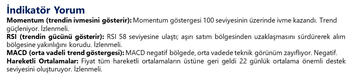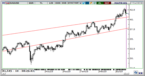 Trend ve momentum göstergeleri yükselişin momentumlu biçimde sürdüğüne işaret ediyor. Fiyat 41,5 $ çevresinde tutunurken, kısa vadede 41,50–44,50 $ aralığının üst bandına doğru hareket olasılığı masada. Destekler: 41,50 $ ve 40,70 $; Direnç: 43,00 $ (üzeri kapanışta 44,50 $ bandı gündeme gelebilir).