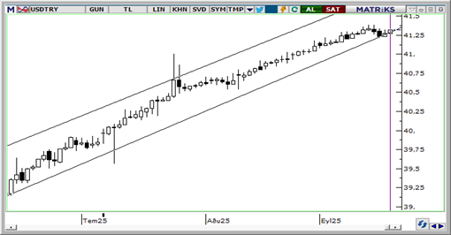 Günlük grafikte yükseliş kanalı korunurken kur 41,30 civarında işlem görüyor. Kısa vadede siyasi haber akışı kaynaklı bir oynaklık olmazsa 41,00–41,70 bandında dalgalanmanın sürmesini bekliyoruz. Teknik görünüm, fiyatın yükselen kanalın alt bandından destek alıp bu seviyenin üzerinde seyrin devam edebileceğini gösteriyor. USDTRY’de 41,18, 41,10 ve 41,06 seviyeleri yakın vadeli destek konumunda yer alıyor.