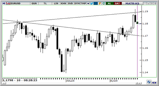 Fed’in dünkü 25 bp indirimi sonrasında parite 1,18 eşiği etrafında dengelenmiş durumda. Yukarı yönlü ivme korunursa 1,19 test edilebilir; orta vadede 1,17–1,20 bandını baz senaryo olarak izliyoruz. 1,1735 / 1,1760 / 1,1780 destek; 1,1790 / 1,1810 / 1,1830 direnç.