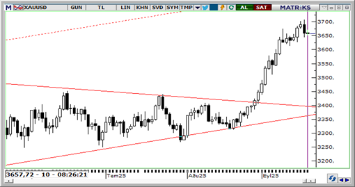 Teknik indikatörlerden alınan sinyaller ve temel faktörler kapsamında ons altında yükseliş eğiliminin sürdüğünü değerlendiriyoruz. Günlük grafik görünümünde izlenen bayrak formasyonu, fiyatların 3.750 $ seviyesinin üzerine doğru hareket etme potansiyeline işaret ediyor. Bu kapsamda, geri çekilmelerin düzeltme mahiyetinde ve sınırlı kalmasını bekliyoruz. Destekler: 3.660 / 3.610 / 3.580 $.