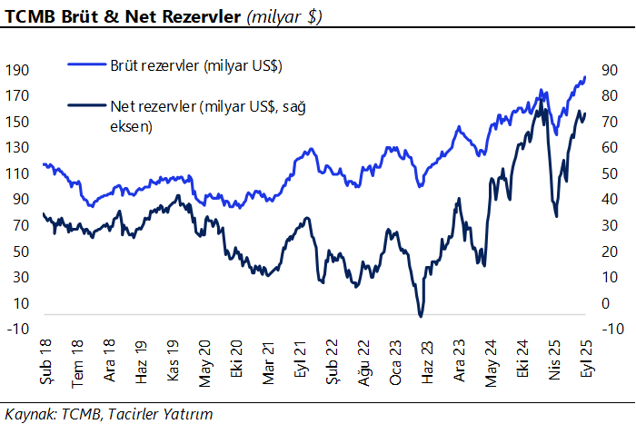 19 – 26 Eylül haftasında yabancı yatırımcılar hisse senedi piyasasında 158,8 milyon dolar, tahvil piyasasında ise (repo işlemleri hariç) 415,7 milyon dolar net alım gerçekleştirdi. Yabancı yatırımcının toplam tahvil stoku içerisindeki payı ise %6,6’dan %6,8’e yükseldi. Bu dönemde, yurt içi yerleşiklerin altın hariç parite etkisinden arındırılmış DTH’ları 1,8 milyar dolar, altın dahil toplam DTH hesapları ise fiyat etkisinden arındırılmış olarak 1,3 milyar dolar geriledi. 19 – 26 Eylül haftasında TCMB net döviz rezervi 2,3 milyar dolar artışla 72,7 milyar dolar, brüt döviz rezervi ise 4,1 milyar dolar yükselişle 183,1 milyar dolar oldu. Swap stoku bu dönemde 1,7 milyar dolar gerileyerek 15,6 milyar dolara inerken, swap hariç net rezerv ise 4,1 milyar dolar artışla 57,1 milyar dolar oldu. Ayrıntılı rapor için tıklayınız.