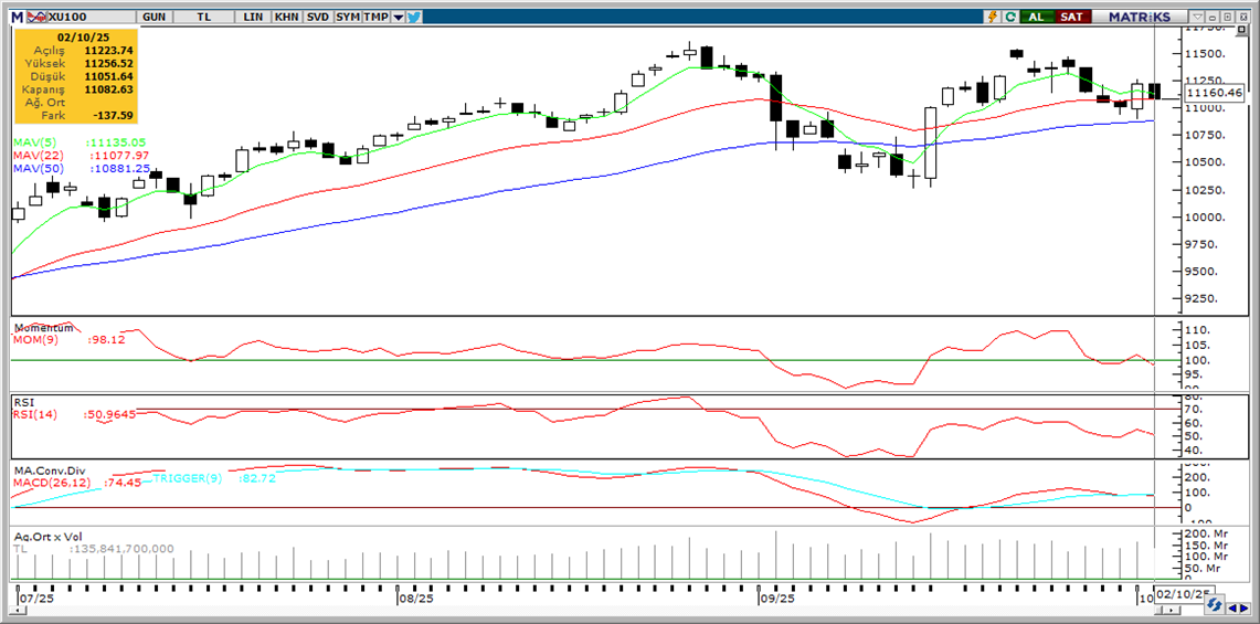 Günaydın. Küresel risk iştahı genel olarak pozitif. ABD’de hükümetin kapanma sürecinin fazla uzamayacağı beklentisi ve teknoloji şirketlerine gelen alımlar Wall Street’i desteklemeye devam ediyor. ABD ve Avrupa vadelileri ile Asya borsaları bu sabah alıcılı. Borsa İstanbul’da ise, önceki gün, günün dip seviyelerinden gelen %3,5’a yakın alımların ardından dün kar satışları ile %1,2 düşüş yaşandı ve kapanış 11.082 seviyesinden gerçekleşti. Endekse en fazla pozitif katkı sağlayan ilk beş şirket TCELL, GRTHO, PGSUS, MPARK, AKSA olurken; endekse negatif etki edenler ise DSTKF, AKBNK, ISCTR, YKBNK, GARAN oldu. Para girişi açısından baktığımızda ise, PGSUS, EKGYO, TCELL, EREGL ve BIMAS dikkat çekiyor. BIST’e genel olarak baktığımızda momentum kaybı devam ediyor diyebiliriz, ancak bu durumun belirgin bir gerilemeden ziyade yatay bir bant hareketi getirdiğini görüyoruz. Bu bant hareketi, 10.800 – 11.300 dar bandı ile 10.300 – 11.600 geniş bandı olarak izlenebilir. Risk iştahında artı ya da eksi yönde anlamlı bir değişim olmadığı sürece bu bantlarda sıkışma devam edebilir. Günün ajandasında içeride Eylül ayı enflasyon verileri öne çıkıyor. Aylık bazda %2,5 civarında bir TÜFE ile yıllık TÜFE’nin %33’ten %32,5 civarına gerilemesi bekleniyor. ABD’de ise, hükümetin kapanması süreci nedeniyle haftalık işsizlik maaşı başvuruları ve fabrika siparişleri dün açıklanamadı, bugün de tarım dışı istihdam verisinin açıklanması beklenmiyor. Bu süreç uzadıkça, Fed’den 29 Ekim’de faiz indirim beklentisi azalacak ve piyasalar açısından negatif olacaktır. Türkiye 5 yıl vadeli CDS primleri bu sabah 256 baz puandan güne başlıyor.
