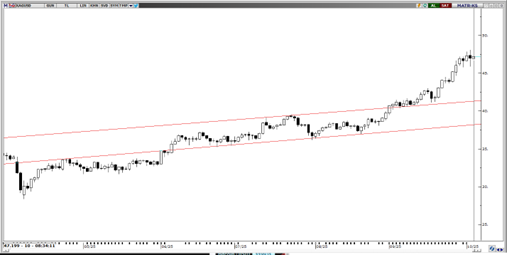 USDTRY’de istikrarlı biçimde süren yukarı yönlü hareket, günlük periyotta görülen yükseliş kanalıyla paralellik gösteriyor. Bu çerçevede, kısa vadede 41,20–42 bandında fiyatlamalar öne çıkarken, görünüm kademeli trendin sürdüğünü ve 41,20 seviyesinin altında kalıcılığın güç olduğunu işaret ediyor. Destek seviyeleri olarak 41,40 ve 41,20 seviyeleri takip edilebilir.