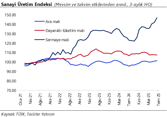 Temmuz ayında mevsim ve takvim etkilerinden arındırılmış sanayi üretimi aylık bazda %1,8 azalırken, takvim etkilerinden arındırılmış sanayi üretimi ise yıllık bazda %5 artış kaydetti. Dış ticaret verileri, sanayi üretimi tahminlerimiz açısından yol gösterici nitelikte. Ağustos verilerinde altın ve enerji harici ara malı ithalatı aylık %18,3 gerilerken, yıllık bazda ise %2,6 oranında düşüş gösterdi. Diğer bir önemli öncü gösterge olan İstanbul Sanayi Odası (İSO) Türkiye İmalat PMI ise ağustosta 45,9’dan 47,3’e yükselerek ocak ayından bu yana ilk artışını kaydederken, endeksin 50 eşik değerin altında kalmaya devam etmesi imalat sanayi aktivitesindeki daralmanın sürdüğüne işaret etti. Öncü sinyaller doğrultusunda ağustos ayında mevsimsel etkilerden arındırılmış aylık sanayi üretiminin daralma bölgesinde kalmaya devam etmesini, takvim etkilerinden arındırmış sanayi üretiminin ise yıllık bazda önceki aya göre gerilemesini beklemekteyiz.