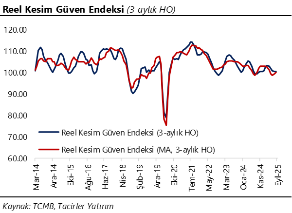 Arındırılmamış reel kesim güven endeksi (RKGE) eylül ayında 100,6 seviyesinden 100,2’ye gerilerken, mevsim etkilerinden arındırılmış endeks seviyesi ise 100,6’dan 100,8’e yükseldi. Böylelikle, yılın ikinci çeyreğinde ortalama 101,6 seviyesinde oluşan arındırılmamış RKGE seviyesi, ikinci çeyrekte 100,3’e geriledi. Bunun yanı sıra, kapasite kullanım oranı (KKO) eylül ayında %73,5’ten %74’e, mevsimsel etkilerden arındırılmış KKO ise %73,6 seviyesinden %73,8’e yükseldi. İkinci çeyrekte elde edilen güçlü büyümenin ardından öncü göstergeler, yılın üçüncü çeyreğinde ekonomik faaliyette yavaşlama sinyalleri veriyor. Sanayi sektörü aktivitesinde ikinci çeyrekte görülen hızlı yükselişte (%6,1), düşük baz etkisi belirleyici oldu. Bu etkinin üçüncü çeyrek itibariyle hafiflemesini ve sanayi sektöründeki zayıf eğilimin daha belirgin olmasını bekliyoruz. 2025 yıl sonu büyüme tahminimizi, güçlü gelen ikinci çeyrek büyüme verileri ve TÜİK’in Ulusal Hesaplar Sistemi’nde gerçekleştiği ana revizyon sonrasında %3,1 seviyesinden %3,4’e revize ettik.