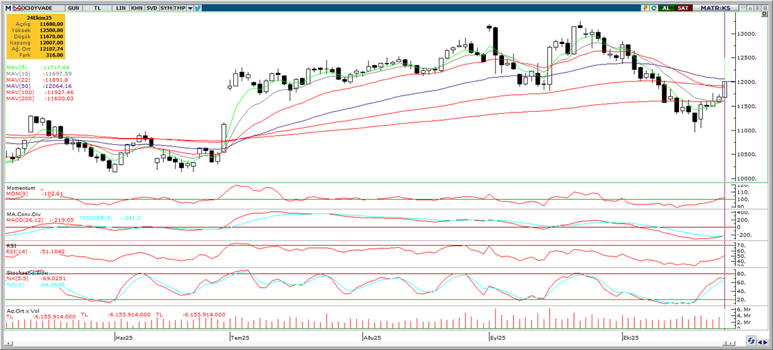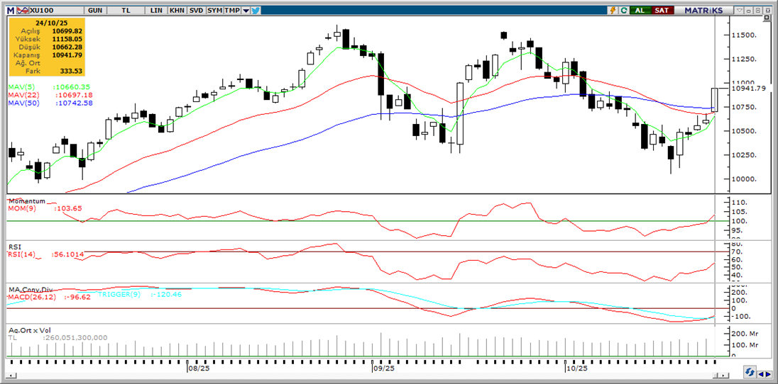 Günaydın. Küresel piyasalarda ABD – Çin müzakerelerinde “ön anlaşma” iyimserliği devam ediyor. Liderler düzeyindeki görüşmelerin ise Perşembe günü Güney Kore’de gerçekleşecek olan Asya – Pasifik Ekonomik İşbirliği Örgütü toplantılarında gerçekleşmesi bekleniyor. Cuma sabahı olduğu gibi, bu sabah da ABD ve Avrupa vadelileri ile Asya borsalarının tamamı alıcılı. Borsa İstanbul’da ise, Cuma günü CHP kurultay davasının “aktif husumet yokluğu ve davanın konusuz kaldığı gerekçesiyle reddine karar verilmesi” sonrasında 11.158’e kadar hızlı bir tırmanış yaşanmasına rağmen kapanış 10.941 seviyesinden gerçekleşti. BIST 100 Endeksi %3.14 yükselişle günü tamamlarken endekse en fazla pozitif katkı sağlayan ilk beş şirket BIMAS, ISCTR, THYAO, YKBNK, KCHOL oldu. Geçtiğimiz hafta genelinde para girişleri ile öne çıkan şirketler ise ISCTR, YKBNK, TUPRS, TCELL, KRDMD, TAVHL ve KCHOL oldu. Bu sabaha baktığımızda, küresel borsalarda devam eden güçlü görünüme karşın, hafta sonu İBB Başkanı Ekrem İmamoğlu ve bazı isimler için casusluk soruşturması kapsamında tutuklama kararı alınmasının Borsa İstanbul’u sınırlayacağını düşünüyoruz. BIST 100 endeksinde 10.700 ilk destek, 11.150 ise ilk direnç olarak izlenebilir. Günün ajandasında içeride reel sektör güveni, kapasite kullanımı ve işsizlik oranı izlenecek. Dışarıda ise Avrupa’da 1 ve 3 yıllık enflasyon beklentileri, ABD’de dayanıklı mal siparişleri (hükümetin kapalılığı nedeniyle açıklanmayabilir) ve Dallas Fed imalat endeksi takip edilecek. Türkiye 5 yıl vadeli CDS primleri Cuma günü 250 – 252 baz puana kadar hızlı bir gerileme göstermişti. Bu sabah da güne 252 baz puandan başlıyor.