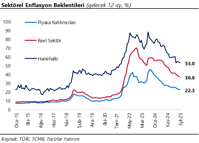 TCMB’nin eylül ayına ilişkin yayınlanan Sektörel Enflasyon Beklentileri Anketi’ne göre, 12 ay sonrasına ilişkin yıllık enflasyon beklentileri bir önceki aya göre; piyasa katılımcıları için 0,6 puan azalarak %22,3’e, reel sektör için 0,9 puan azalarak %36,8’e, hanehalkı için ise 1,1 puan azalarak %53 seviyesine geriledi. Beklentilerin üzerinde gerçekleşen eylül ayı TÜFE verilerinin ardından ekim ayı Piyasa Katılımcıları Anketi sonuçlarında enflasyon tahminlerinde önemli bir yükseliş takip ettik. Bu çerçevede, piyasa katılımcılarının 2025 yıl sonu TÜFE beklentisi ekim ayında %29,86 seviyesinden %31,77 seviyesine çıktı. Ek olarak, katılımcıların 12 ay sonrası TÜFE beklentisi %22,25’ten %23,26’ya, 24 ay sonrası TÜFE beklentisi ise %16,78’den %17,36’ya çıktı. Ekim ayına ilişkin yayınlanacak olan Sektörel Enflasyon Beklentileri anketinde, piyasa katılımcıları beklentilerinde bozulmanın reel sektör ve hanehalkı tarafında da görülmesini bekliyoruz.
