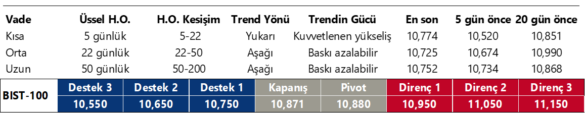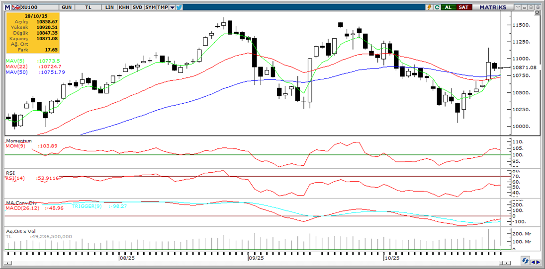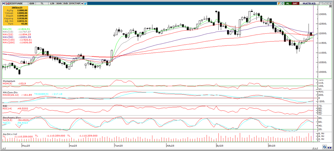 Günaydın. ABD – Çin müzakerelerinden gelen olumlu mesajlara karşın küresel risk iştahı yeni güne karışık bir başlangıç yapıyor. Fed’den 25 baz puanlık faiz indirimi ve bilanço küçültme sürecinin Aralık’ta sona erdirileceği mesajı pozitif, “10 Aralık’taki Fed toplantısında faiz indirimi kesin değil” mesajı ise iyimserliği sınırlıyor. ABD ve Avrupa vadelileri bu sabah yatay, Asya borsaları ise genel olarak alıcılı. Borsa İstanbul’da 11.150 seviyesi test edildikten sonra 10.900 altına geri çekilme yaşandı, kısa vadede 10.700 desteği ile 11.150 direnci arasında sıkışmanın devam edebileceğini düşünüyoruz. Küresel etkiler bu dönemde sınırlı, içeride ise ajanda kısmen sakin. BIST’te işlem gören şirketlerin 3Ç25 sonuçları açıklanıyor, henüz tüm şirketlerin %10’unun sonuçlarını gördük. Genel görünüm açısından net bir resimden bahsetmek için erken, ancak bankaların genel olarak beklentilerden daha yüksek karlar açıklamaya devam ettiklerini, banka dışı kesim şirketlerinin ise 2Ç25’te olduğu gibi yaklaşık %20’sinin yıllık bazda reel büyümeler elde edebildiğini görüyoruz. Günün makro veri takviminde, Avrupa ve ABD büyüme verileri öne çıkıyor. Yarın ise ABD ve Avrupa’da enflasyon verileri izlenecek. ABD’de hükümetin kapalılık hali 30. gününde de devam ediyor, bu nedenle kritik verilerin açıklanma süreci aksayabilir. Türkiye 5 yıl vadeli CDS primleri yeniden 250 baz puan altında ve güne 246 baz puandan başlıyor. Burada gerilemenin devam etmesi XBANK Bankacılık Endeksi’ni destekleyecektir.