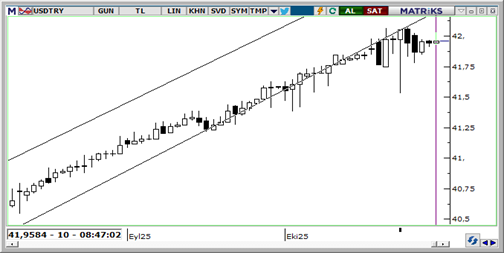 USD/TRY paritesinde devam eden yukarı yönlü eğilim, günlük grafiklerde izlenen pozitif kanal yapısı ile paralel bir görünüm sergiliyor. Teknik olarak bakıldığında, kısa vadeli fiyatlamaların 41,20–42 aralığında yoğunlaştığı, ana trendin kademeli olarak yukarı yönlü momentumunu sürdürdüğü ve 41,20 seviyesinin altına olası geri çekilmelerin sınırlı bir düzeltme niteliğinde kalabileceği değerlendiriliyor. Destek seviyeleri olarak 41,40 ve 41,20 seviyeleri takip edilebilir.