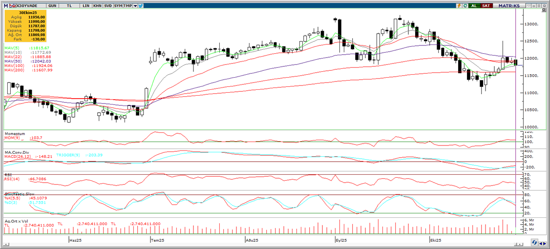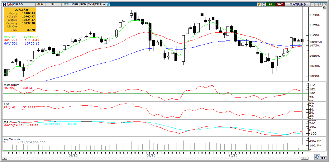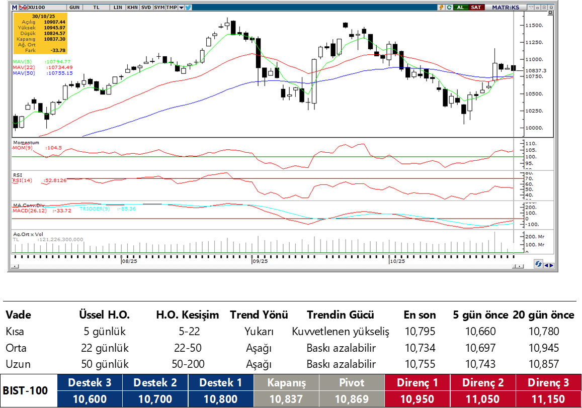 Günaydın. Küresel risk iştahı bu sabah dengeli. Dün ABD’de teknoloji şirketlerine satışlar gelmişti, ancak sonrasında Apple ve Amazon finansalları olumlu tarafta açıklandı, ABD vadelileri bu sabah alıcılı. Avrupa vadelileri hafif negatif tarafta, Asya piyasalarında ise karışık bir görünüm var. Borsa İstanbul'da dün sınırlı bir geri çekilme yaşadık, 10.700 ara destek seviyesi üzerinde tutunma devam ediyor. BIST 100 Endeksi dün %0.31 gerilerken endekse en fazla pozitif katkı sağlayan ilk beş şirket DSTKF, AKBNK, KOZAL, SAHOL, GARAN oldu. Son bir haftalık dönemde düzenli para girişi gördüklerimiz ise KOZAL, EREGL, SISE ve ENKAI. Günlük bazda ise AKBNK, PGSUS ve EKGYO dikkat çekiyordu. Bu sabah, dışarıya da paralel olacak şekilde hafif pozitif bir açılış bekliyoruz. Ancak şunu da hatırlatmak gerekiyor, bugün VİOP'ta işlem gören Ekim vadeli kontratların son işlem günü. Bu nedenle özellikle arbitraj pozisyonlarındaki çözülmeler Borsa İstanbul'da bir miktar baskı yaratabilir. Bu taraftan gelebilecek satışların karşılanacağını düşünüyoruz. Günün ajandasında içerde ticaret dengesi ve turizm verileri, Avrupa'da enflasyon verileri takip edilecek. Amerika'da normalde çekirdek kişisel tüketim harcamaları verisinin bugün açıklanması gerekiyor, fakat hükümetin kapalılık hali devam ettiği için açıklanması beklenmiyor. Türkiye 5 yıl vadeli CDS primleri yeniden güne 246 baz puandan başlıyor.