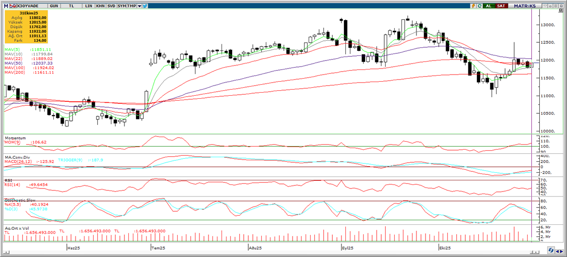 Günaydın. Küresel risk iştahı yeni haftaya olumlu başlıyor. ABD – Çin ilişkilerinde iyileşme beklentileri bu sabah ABD ve Avrupa vadelileri ile Asya borsalarına alım getirmekte. Borsa İstanbul’da Cuma günü 11 bin’in hemen altında kapanış ve belirgin para girişi gördük. Bu iyimserliğin devamını bekliyoruz. Ancak, saat 10:00’da borsanın açılışı ile beraber enflasyon verileri takip edilecek. Aylık %2,5 ve altı bir TÜFE verisi borsayı destekler, %3,00 ve üzeri bir rakam ise satış getirebilir. Tacirler Yatırım olarak ekim ayı aylık TÜFE artışının %2,71 seviyesinde oluşmasını bekliyoruz. Beklentimize paralel bir gerçekleşme, yıllık TÜFE’de %33,3’ten %33,1’e sınırlı bir gerilemeye işaret edecek. Yılın son iki ayında aylık enflasyonda belirgin bir yavaşlama bekliyoruz. Aylık enflasyonun kasım ayında, mevsimselliğin etkisi ile birlikte %2’nin altına inmesini, aralık ayında ise %1’e doğru gerileyeceğini tahmin ediyor. 2025 yıl sonu TÜFE tahminimiz %31,5, 2026 yıl sonu TÜFE tahminimiz ise %23 seviyesinde. Bugünkü enflasyon verilerinin ardından gözler 7 Kasım Cuma günü gerçekleşecek olan TCMB 2025 – 4. Çeyrek Enflasyon Raporu sunumuna çevrilecek. Günün ajandasında ayrıca PMI verileri izlenecek. Haftanın devamında ise ABD’de istihdam verileri öne çıkıyor, ancak hükümetin kapalılık hali devam ettiği için veriler açıklanmayabilir. Türkiye 5 yıl vadeli CDS primleri yeniden güne 245 baz puandan başlıyor.