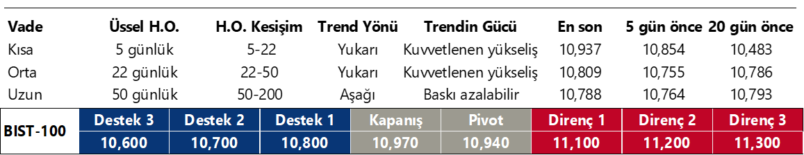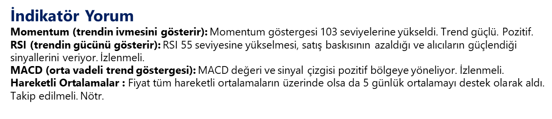 Günlük grafikte devam etmekte olan yükseliş kanalı, USD/TRY’de kademeli yükseliş eğiliminin korunduğuna işaret ediyor. Trend ve momentum indikatörleri, kurda yakın vadede 42 seviyesi altında kalıcı bir düşüşün zor olduğunun ve yıl sonuna kadar 42 – 44 bandının ön planda olabileceğinin sinyalini veriyor. Kurda 42 ve 41,85 seviyelerini kısa vadeli destek olarak takip ediyoruz.