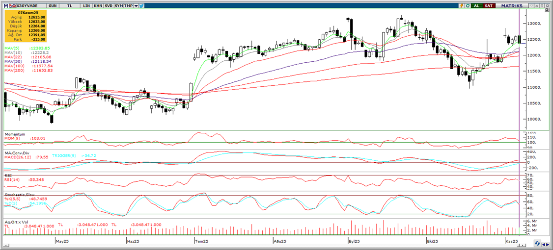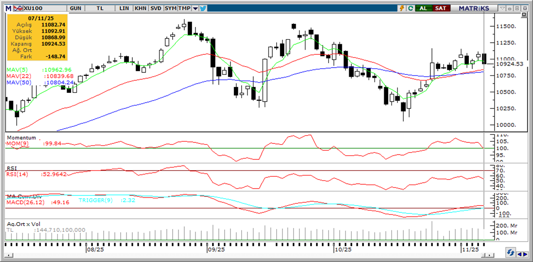 Günaydın. Küresel piyasalar yeni haftaya iştahlı bir başlangıç yapıyor. ABD’de Demokratlar ve Cumhuriyetçiler’in geçici bütçe konusunda anlaştığına ve 40 gündür devam eden hükümetin kapalılık halinin yakında sona ereceğine dair haberler iyimserliği destekliyor. ABD ve Avrupa vadelileri bu sabah belirgin şekilde pozitif, Asya’da da yine güçlü yükselişler var. Güney Kore’de temettü gelirlerinden verginin düşürülmesi ve teşvikler %3’e varan yükselişler getiriyor. Borsa İstanbul’da ise, Cuma günü %1,3 düşüşle yeniden 11 bin altına geriledik. Bunun temel nedeni, TCMB’nin yılın 4. Enflasyon Raporu sunumunda 2025 için enflasyon beklenti bandını %25 – 29 aralığından %31 – 33 aralığına yükseltmesi ve sıkı parasal duruşun devam edeceği mesajı vermesi oldu. Özellikle bankalara gelen satışlar BIST’teki gerilemede etkili oldu. Cuma günü endekse pozitif katkı sağlayan ilk beş şirket MGROS, IEYHO, BIMAS, TURSG, KOZAL olurken, geçen hafta düzenli para girişi ile dikkat çeken şirketler ise MGROS, TUPRS, KCHOL, SKBNK, DOHOL oldu. Bugün, BIST’te yeniden 11 bin üzerine yönelim çabası göreceğimizi düşünüyoruz. 10.800 / 10.850 bandı ilk destek aralığı, 11.100 / 11.150 bandı ise ilk direnç aralığı olarak izlenebilir. Günün ajandasında içeride Eylül ayı sanayi üretim verileri takip edilecek. 3. çeyreğin son ayına dair veriler 3Ç25 büyüme performansı açısından da ipuçları verecektir. Dışarıda ise Avrupa’da Sentix yatırımcı güveni ile ABD toptan satış stokları izlenecek. Türkiye 5 yıl vadeli CDS primleri güne 249 baz puandan başlıyor.