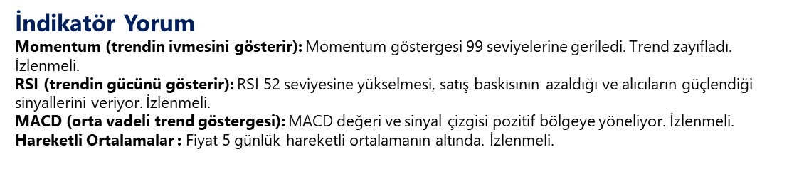 2025 ve 2026 yıl sonu kur tahminlerimiz çerçevesinde, Türk lirasının yakın vadede dolar karşısında reel değer kaybı yaşamasını beklemiyoruz. Paritenin kanal içinde hareketine devam etmesi bizlere kademeli yükseliş eğiliminin devam ettiğini gösteriyor. Trend ve momentum indikatörleri, yıl sonuna kadar 42 – 44 bandının göz önünde olacağının sinyalini vermekle beraber aynı zamanda 42 seviyesinin altına düşüşlerin zor olacağına işaret ediyor. Kurda 42 ve 41,85 seviyelerini kısa vadeli destek olarak takip ediyoruz.