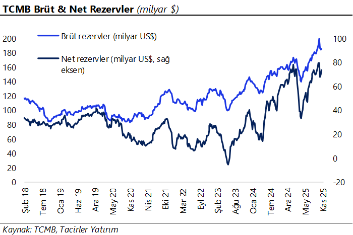 Günaydın. ABD’de hükümetin açılmasına karşın, bazı Fed yöneticilerinin Aralık’ta faiz indirimi olmayabileceği mesajları ve teknoloji şirketlerine gelen satışlar dün ABD borsalarında %2’lere varan geri çekilmeler yaşattı. Avrupa borsalarının dün, Asya borsalarının ise bu sabah ABD’deki satışlara eşlik ettiğini görüyoruz. Vadeliler ise bu sabah yatay. Fed odaklı beklentilerde, bundan sonraki ilk faiz indirimine dair fiyatlamanın Mart 2026’ya ötelenmesi dikkat çekiyor. Muhtemelen, bir süre boyunca bu konuda yoğun bir haber akışı ve açıklama trafiği ile sürekli bir algı değişimi göreceğiz. Bu nedenle, Fed beklentilerine dayalı volatilitenin en azından 10 Aralık Fed toplantısına kadar süreceğini düşünüyoruz. Bu durumun TL varlıklara etkisi sınırlı kalabilir, ancak küresel borsalar ve kıymetli madenler bu volatiliteden etkilenebilir.