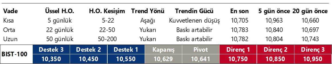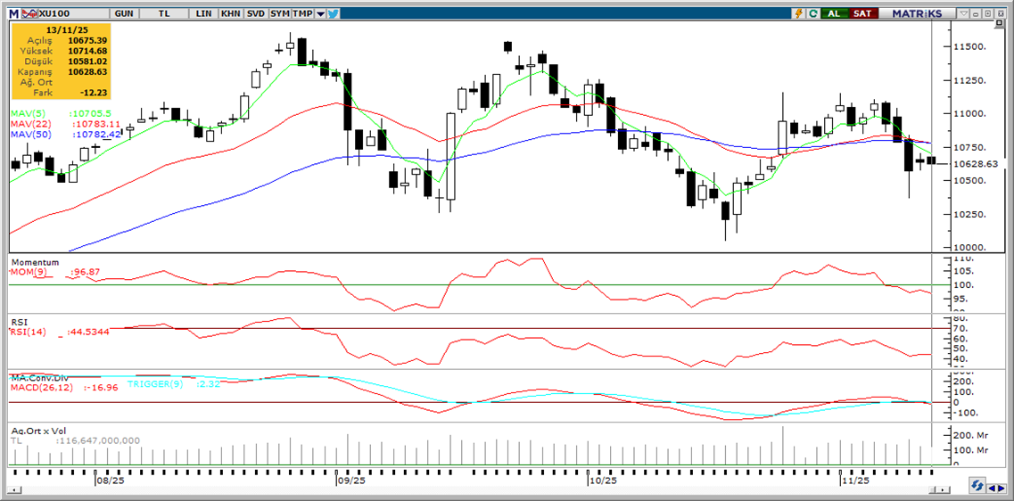 BIST’te dün %0,11 gerileme yaşanırken TUPRS, THYAO, KOZAL, ENERY, CANTE endekse pozitif katkı sağladı, ASELS, BIMAS, SASA, KUYAS ve PASEU ise endeksi aşağı çekti. Son bir haftada düzenli para girişi ile dikkat çeken şirketler ise VAKBN, CIMSA, OYAKC, TTKOM, TOASO ve SISE. Bugün, dışarıdaki satışlara paralel 10.580’den geçen ve üç gündür test edilen destek bir kez daha test edilebilir, tepki halinde ise 10.700 / 10.800 direnç bölgesi izlenecektir. Günün ajandasında, içeride TCMB Piyasa Katılımcıları Anketi, Avrupa’da büyüme verileri, ABD’de ise perakende satışlar izlenecek. Türkiye beş yıl vadeli CDS primleri ise güne 245 baz puandan başlıyor.