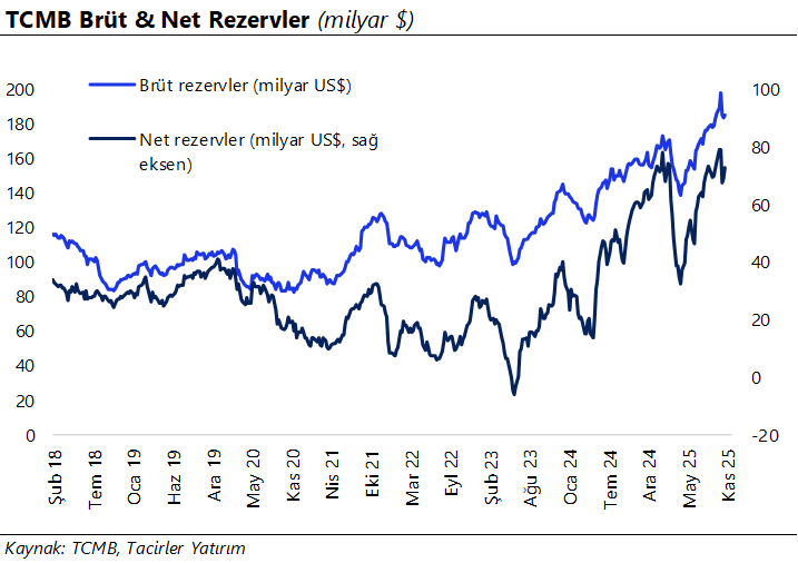 Bugün saat 14:30’da 7 – 14 Kasım haftasına ilişkin yabancı menkul kıymet ve para & banka istatistikleri ile uluslararası rezerv verileri açıklanacak. Yabancı yatırımcılar, 31 Ekim – 7 Kasım haftasında hisse senedi piyasasında 35,7 milyon dolar, tahvil piyasasında ise repo işlemleri hariç 311,5 milyon dolar net alım gerçekleştirdi. Yabancı yatırımcının tahvil stoku içerisindeki payı ise %6,7 seviyesinden %6,8’e yükseldi. Aynı hafta içerisinde yurt içi yerleşiklerin altın hariç parite etkisinden arındırılmış DTH’ları 1,3 milyar dolar gerilerken, altın dahil toplam DTH hesapları ise fiyat etkisinden arındırılmış olarak 625 milyon dolar azaldı. 31 Ekim – 7 Kasım haftasında TCMB net döviz rezervi 3,9 milyar dolar artışla 73,1 milyar dolar, brüt döviz rezervi ise 1,5 milyar dolar yükselerek 185,1 milyar dolar oldu. Swap stoku bu dönemde 1,7 milyar dolar azalarak 15 milyar dolara inerken, swap hariç net rezerv ise 5,7 milyon dolar yükselerek 58,2 milyar dolar oldu. Ayrıntılı rapor için tıklayınız.