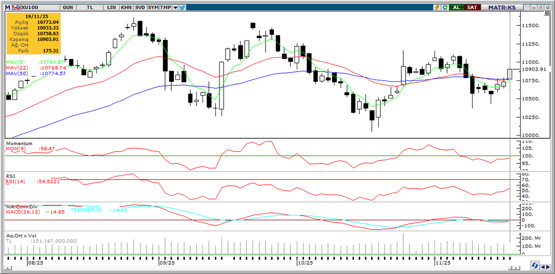 Günaydın. Nvidia’nın beklentileri aşan 3Ç25 sonuçları ABD borsaları öncülüğünde küresel borsalara alım getiriyor. Fed’den faiz indirim beklentilerinin dünkü tutanaklarla daha da azalması sonrasında Nvidia etkisinin çok uzun soluklu olacağını düşünmüyoruz. Ayrıca, ABD’de hükümetin kapalı kaldığı dönemde sağlıklı veri toplanamadığı için Ekim ayı istihdam verilerinin açıklanamayacağı bildirildi. Eylül istihdam verilerinin ise bugün açıklanması bekleniyor. Fed’in Aralık ayında ve sonrasında alacağı aksiyona dair belirsizliklerin bir süre daha devam edeceğini, faiz indirim beklentileri ötelendikçe de bunun ABD borsaları üzerindeki baskısının süreceğini düşünüyoruz. Yine de Nvidia destekli pozitif hava hafta sonuna kadar etkisini koruyabilir.Borsa İstanbul’da dışarıya görece uzun süreli negatif ayrışma ardından, son dönemde belirginleşen pozitif ayrışma devam ediyor. Dün Avrupa borsalarında negatif seyir yaşanırken, BIST 100 Endeksi artan hacim ve para girişi ile beraber %1,63 yükselerek 10.900’e tırmandı ve tüm hareketli ortalamaları üzerinde bir kapanış sergiledi. Endekse en fazla pozitif katkı sağlayan ilk beş şirket THYAO, AKBNK, DSTKF, YKBNK, BIMAS olurken, son bir haftada düzenli para girişi ile dikkat çeken şirketler ise GARAN, KRDMD, DSTKF, IEYHO, SASA, YKBNK ve TUPRS oldu. Kısa vadeli periyotta, BIST 100 endeksinde 11.000 / 11.050 bandı ilk direnç alanı olarak, 10.700 / 10.750 bandı ise ilk destek alanı olarak takip edilebilir.Günün ajandasında içeride tüketici güveni, TCMB rezervleri ve yabancı işlemleri takip edilecek. ABD’de Eylül istihdam verileri, mevcut konut satışları ve Fed yöneticilerinden gelen açıklamalar izlenecek. Türkiye beş yıl vadeli CDS primleri ise güne 245 baz puandan başlıyor.