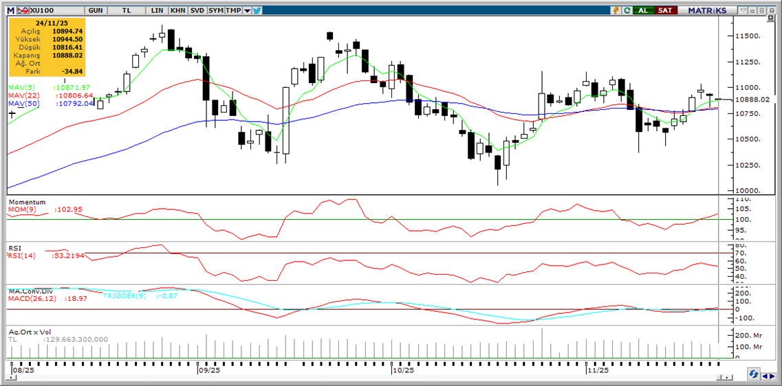 Günaydın. Fed yöneticilerinden arka arkaya iki günde gelen güvercin mesajlar Aralık toplantısına dair faiz indirim beklentilerini artırırken ABD borsalarına da tepki alımları getiriyor. Bu iyimserliğin kırılgan bir zeminde ilerlediğini belirtelim, ancak kısa vadede küresel borsalara destek vermeyi sürdürebilir. Majör ABD endekslerinde dün %0,44 - %2,69 arası yükselişler yaşanırken ABD vadelileri bu sabah hafif negatif bölgede. Avrupa vadelileri, yapay zeka sürecinde geride kaldıklarına dair uyarılar ve bölge ekonomilerine dair son dönemde artan kaygılarla negatif seyrederken, Asya’da ise ABD’de dün yaşanan yükseliş bu sabah fiyatlanıyor. Borsa İstanbul’da ise, Cuma günü momentumda yaşanan zayıflık dün de %0,3 gerileme ile devam etti, ancak yabancı alımları, para girişi ve önceki güne göre hacimde artış dikkat çekiyor. BIST’te dünkü düşüşte rafineri marjlarında gerileme endişesi nedeniyle TUPRS, asgari ücrete yüksek zam söylemleri nedeniyle BIMAS ve kısa sürede yaşanan sert yükselişin ardından kar satışı gören TRALT (eski koduyla KOZAL) hisselerindeki satışlar etkili oldu. Dün endekse en fazla pozitif katkı sağlayan ilk beş şirket ise AKBNK, YKBNK, ENKAI, AEFES, KONTR olurken, son bir haftada düzenli para girişi ile dikkat çeken şirketler ise AKBNK, SAHOL, DSTKF, AKENR, ENERY ve ALKLC oldu. BIST 100 endekinde 10.700 / 10.800 bölgesi halen destek, 11.000 / 11.050 bölgesi ise halen direnç olarak izlenebilir. Günün ajandasında içeride TCMB’nin yayımlayacağı sektörel enflasyon beklentileri anketi, ABD’de ise enflasyon, tüketim ve konut sektörüne dair çok sayıda veri takip edilecek. Türkiye beş yıl vadeli CDS primleri yatay, dün sabah olduğu gibi bu sabah da 244 baz puandan başlıyor.