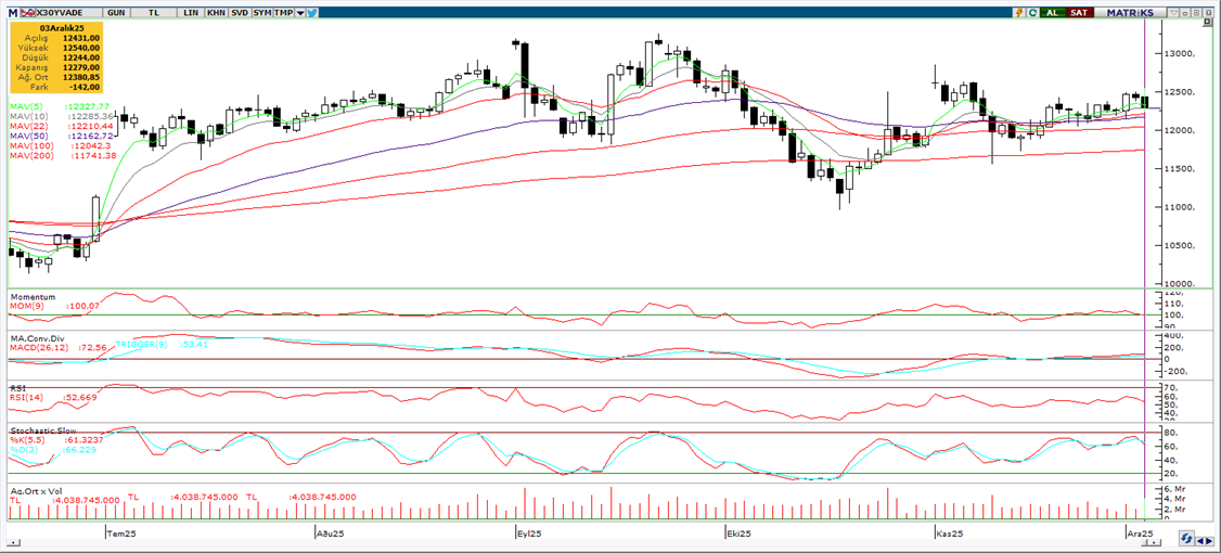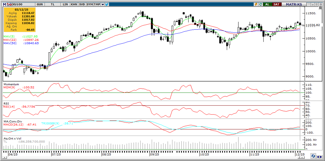 Günaydın. Küresel risk iştahı bu sabah hafif pozitif bölgede. ABD borsaları dün yeniden zirve bölgelere yönelirken vadeliler bu sabah yatay. Avrupa’da ise dünkü yatay seyir sonrasında vadeliler bu sabah belirgin şekilde alıcılı. Asya’da Nikkei güçlü, diğerleri dengeli. Borsa İstanbul’da dün %1,2 – 1,4 bandındaki beklentilerin altında %0,87 seviyesinde açıklanan ve PPK’dan 11 Aralık’ta faiz indirim tahminlerini artan oranlarla destekleyen enflasyon verisi bankalara para girişi ve yükseliş yönünde etki etti. Ancak, düşük enflasyon ve devam eden “asgari ücrete öngörülen enflasyon üzerinde artış” spekülasyonları dün perakende ticaret şirketlerine satış getirdi. FROTO’nun temettüsünden doğan -13 puanlık etki ve DSTKF’nin taban olması ile birleşince dün BIST 100 endeksi %0,78 geriledi. Endekse pozitif katkı sağlayan ilk beş şirket YKBNK, AKBNK, RALYH, CWENE, SAHOL olurken; endeksi negatif etki edenler ise BIMAS, DSTKF, THYAO, ASELS, MGROS oldu. Son bir haftada düzenli para girişi ile dikkat çeken şirketler ise HALKB, SAHOL, OYAKC, VAKBN, LINK, ENKAI ve ALARK. Teknik açıdan 10.950 / 11.000 ve 10.700 / 10.800 destek bölgeleri ile 11.200 / 11.250 ve 11.500 / 11.600 direnç bölgeleri izlenebilir.
