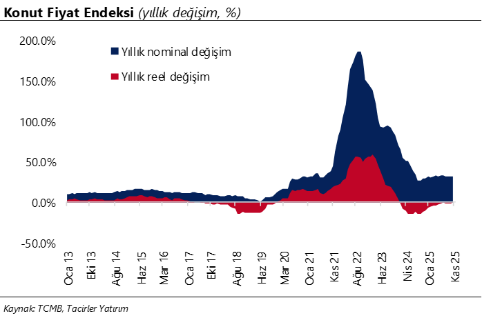 Konut Fiyat Endeksi (KFE) kasım ayında aylık %2,7 ve yıllık %31,4 oranında artış kaydederek 204,2 olurken, fiyatlarda reel bazda ise yıllık %0,3 artış kaydedildi. Böylelikle konut fiyatlarında yıllık reel değişim, Ocak 2024’ten bu yana ilk defa pozitif bölgeye geçti. Bu görünüm, konut satışlarında kasım ayında izlenen zayıflamaya rağmen, arz kısıtları ve maliyet kaynaklı fiyat katılığının devam ettiğine işaret ediyor. Bununla birlikte, mevcut faiz seviyesi ve talep görünümü dikkate alındığında, reel fiyat artışının kısa vadede sınırlı ve kırılgan bir seyir izlemesi olası görünüyor.
