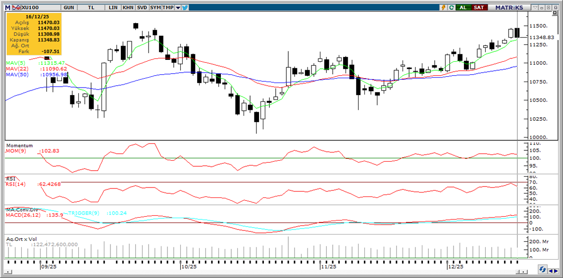 Günaydın. Küresel tarafta zayıf görünüm sürüyor. Zayıf ABD istihdam verilerine karşın Fed’den ilk faiz indirim adımı halen Haziran ayında beklenmekte. Fed üyelerinden gelen son mesajlarda da enflasyon risklerine ve 2026’da hedef üzeri verilerin devam edebileceğine işaret edildi. ABD - Venezuella arasındaki gerginliğin artması, Çin ve Rusya’nın Venezuela’dan yana tavırları da Jeopolitik risk algısında artışa neden oluyor. ABD ve Avrupa borsalarında dün yaşanan satışların ardından vadeli endeks kontratları bu sabah da negatif bölgede. Borsa İstanbul’da da dün zayıf bir seyir yaşanırken BIST 100 Endeksi %0,94 geriledi ve 11.348 seviyesinden kapandı. Endekse en fazla pozitif katkı sağlayan ilk beş şirket TURSG, TRALT, MAGEN, KRDMD, AKBNK olurken, son bir haftada düzenli para girişi ile dikkat çeken şirketler ise AKBNK, KRDMD, YKBNK, MGROS, BIMAS, FROTO, MAVI, KCHOL ve CCOLA oldu. Para girişi devam eden endeks ağırlığı yüksek şirket sayısının artış göstermesini olumlu ve sağlıklı buluyoruz, ancak devam edip etmeyeceği izlenmeli. Teknik açıdan 11.470 ve 11.605 seviyeleri direnç, 11.070 / 11.150 bandı ise destek alanı olarak takip edilebilir. Uzun vadeli değerlemeler ise BIST 100 endeksi için 12 aylık vadede 15.500 civarına işaret ediyor. Ancak, siyasi risklere ilişkin kaygıların devam ettiği bir dönemdeyiz. Bu nedenle, kantitatif analizlerle erişilen hedeflerin kalitatif yaklaşımlarla törpülendiği, bunun da endeksi frenlediği bir süreçteyiz. Günün ajandası sakin. Avrupa’da TÜFE verileri nihai revizyonu dışında önemli veri yok, bu verilerde de bir değişiklik beklenmiyor. Türkiye beş yıl vadeli CDS primlerinde gerileme devam ediyor. CDS’ler bu sabah 214 baz puanda.